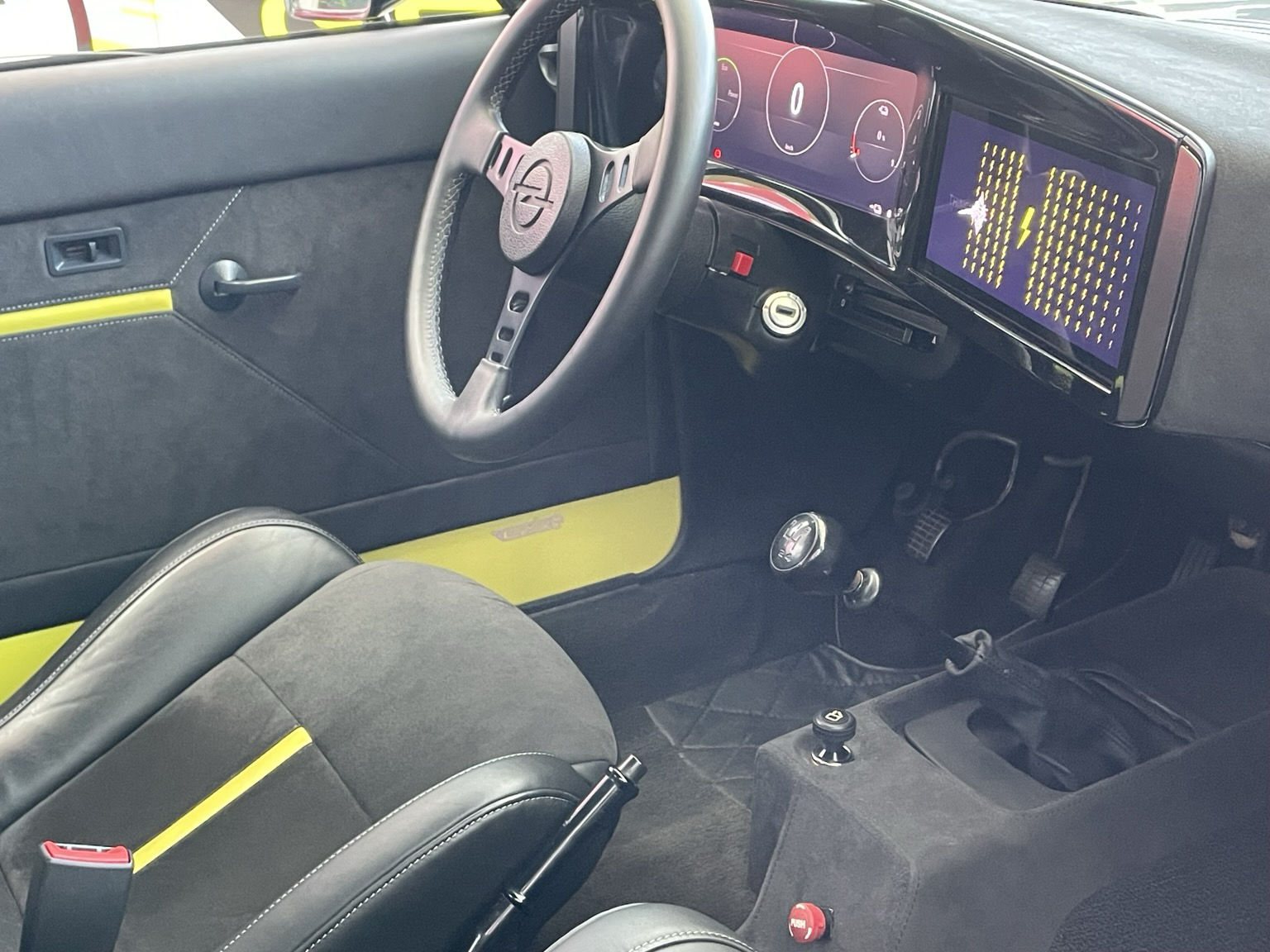 Wie bei einem serienmäßigen Corsa-e oder Mokka-e kann auch der Manta GSe Bremsenergie zurückgewinnen und in der Batterie speichern. Im Innenraum hat die aktuelle Opel-Digitaltechnik Einzug gehalten. Die klassischen Rundinstrumente sind Geschichte, stattdessen blickt der Pilot nun auf ein breites „Pure Panel“ mit zwei fahrerorientierten Widescreens. Die Sportsitze mit ihrer zentralen gelben Dekorlinie sind einst für den Opel ADAM S entwickelt worden. Sie bieten ein im Manta-Original nie gekanntes Niveau an Komfort und Seitenhalt. Der Fahrzeughimmel ist mit feinem schwarzem Alcantara ausgeschlagen und komplettiert das Ambiente.
