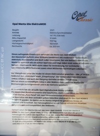 Dieses aufregende Einzelstück verbindet das Beste aus zwei Welten: den klassischen Auftritt einer Stilikone kombiniert mit modernster Technologie - elektrisch, emissionsfrei und doch voller Emotionen. Der rein batterie-elektrische Manta ist sportlich wie ein echter Opel GSe und trägt dabei stolz seine Ambitionen im Namen - ElektroMOD. MOD steht dabei für Veränderung, für technische wie stilistische MODifikationen sowie einen MODernen nachhaltigen Lebensstil. Der Vierzylinder unter der Haube ist einem Elektromotor gewichen - das „e“ in GSe bedeutet nun „elektrisch“ statt „Einspritzung“. Der Hinterradantrieb blieb beim Umbau erhalten und auch das Viergang-Getriebe verblieb im Fahrzeug.